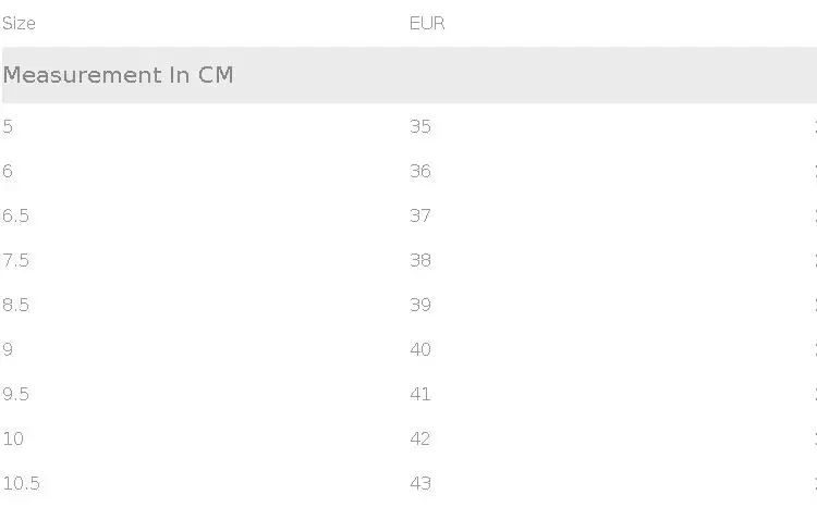 {"sizeInfoList":[{"length":{"cm":"22", "inch":"8.66"}, "size":"4.5", "vid":200000285}, {"length":{"cm":"22.5", "inch":"8.86"}, "size":"5", "vid":698}, {"length":{"cm":"23", "inch":"9.06"}, "size":"6", "vid":1394}, {"length":{"cm":"23.5", "inch":"9.25"}, "size":"6.5", "vid":200000287}, {"length":{"cm":"24", "inch":"9.45"}, "size":"7.5", "vid":200000288}, {"length":{"cm":"24.5", "inch":"9.65"}, "size":"8.5", "vid":200000289}, {"length":{"cm":"25", "inch":"9.84"}, "size":"9", "vid":350262}, {"length":{"cm":"25.5", "inch":"10.04"}, "size":"9.5", "vid":200000290}, {"length":{"cm":"26", "inch":"10.24"}, "size":"10", "vid":1583}, {"length":{"cm":"26.5", "inch":"10.43"}, "size":"10.5", "vid":200000291}, {"length":{"cm":"27", "inch":"10.63"}, "size":"12", "vid":1663}, {"length":{"cm":"27.5", "inch":"10.83"}, "size":"12.5", "vid":200000295}]}